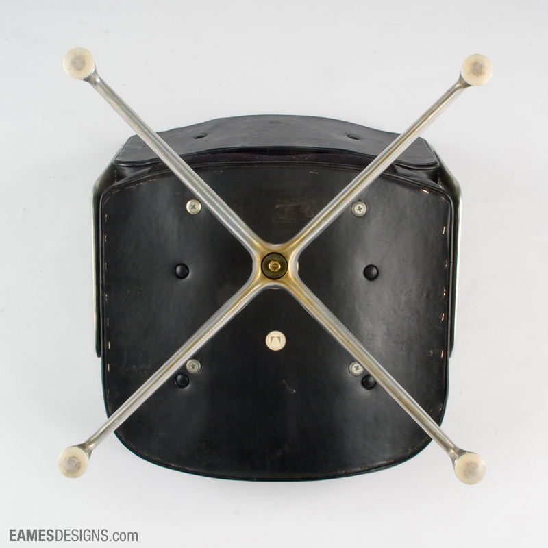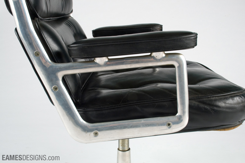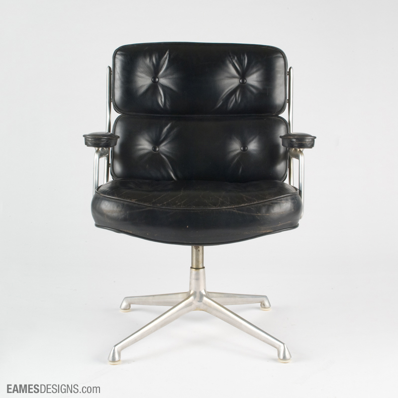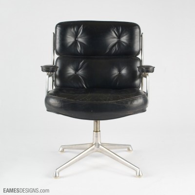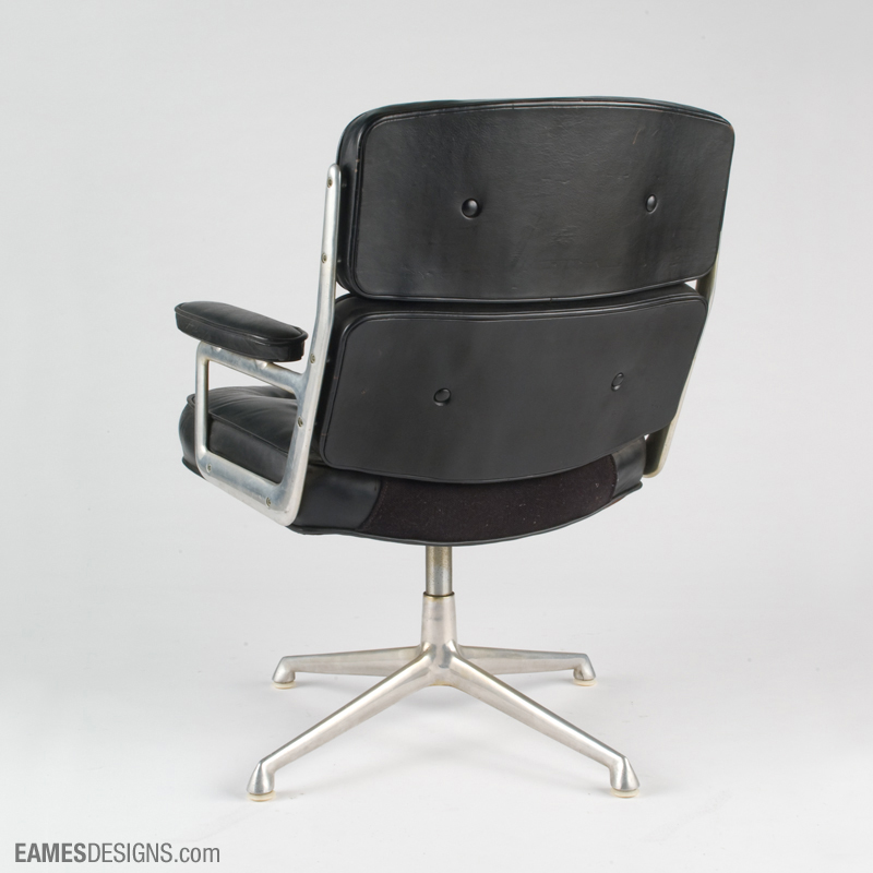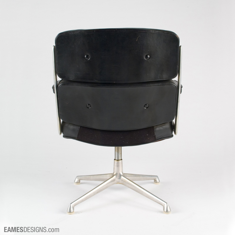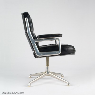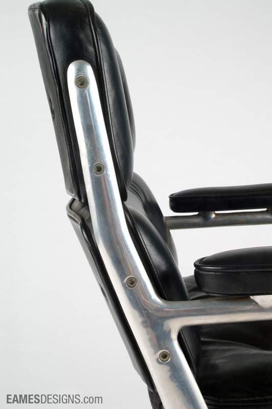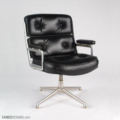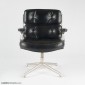 "The lobby-lounge chair provides exceptional comfort in a compact chair which occupies a minimum of visual space. The swivel base makes this chair well suited for office and conference room uses as well as for public spaces and home. Black leather upholstery is particularly desirable with its polished cast aluminum frames and base." Herman Miller Lounge Seating 1961