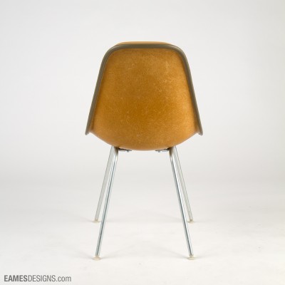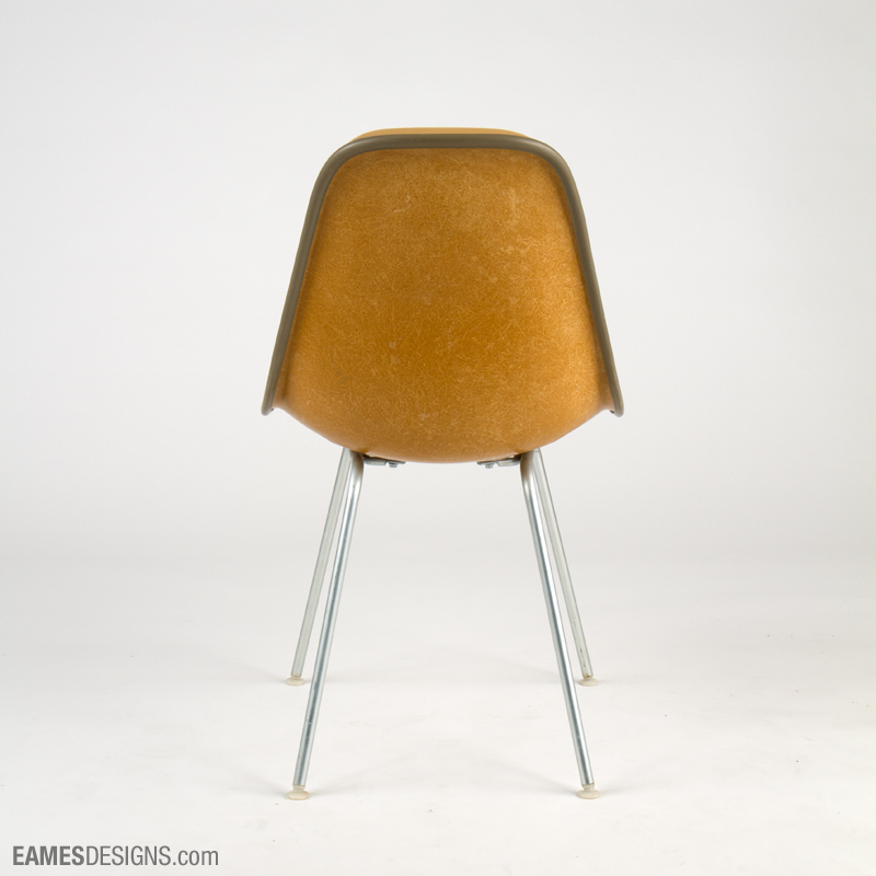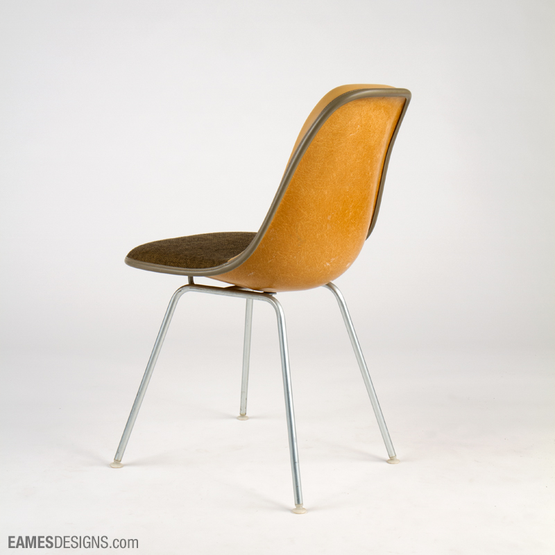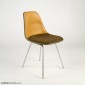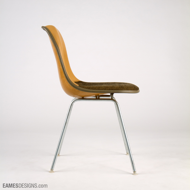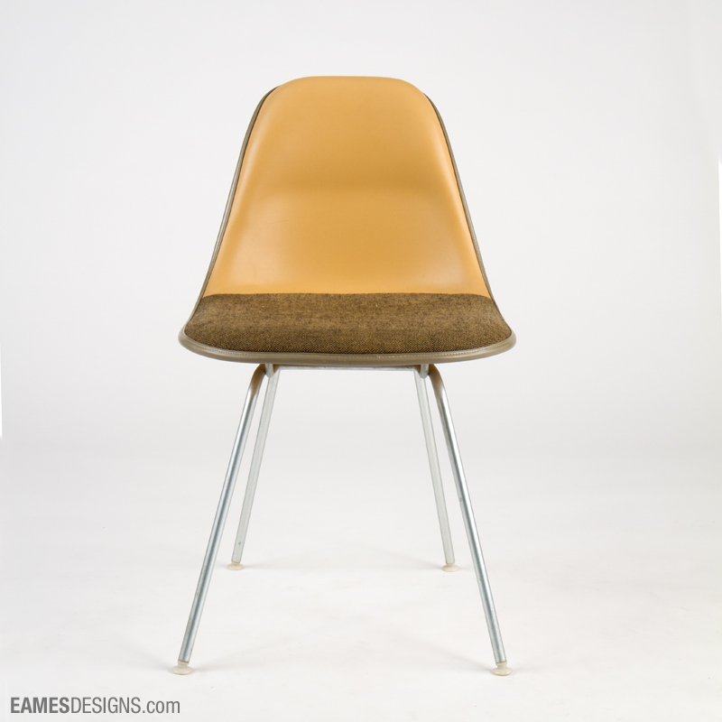 We are still researching the exact designation for this Eames side chair, which has the extra padding on the back characteristic of the Eames posture support chairs, and the vinyl/hopsak mix of the Dash 99 series.