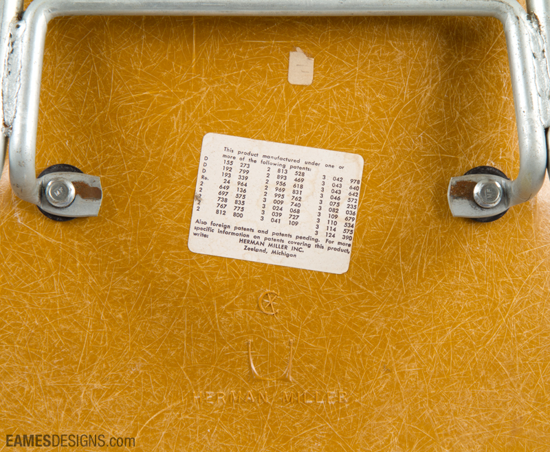 We see on the underside of this shell the "C" and star symbol, the hallmark of Cincinnati Milling Machine, who by this time had been making Eames shells for at least ten years. By working closely with Charles and Ray Eames, the Cincinnati company achieved shells with richer, deeper colors, almost jewel like and certainly more resistant to fading, especially when compared to the early Zenith shells.