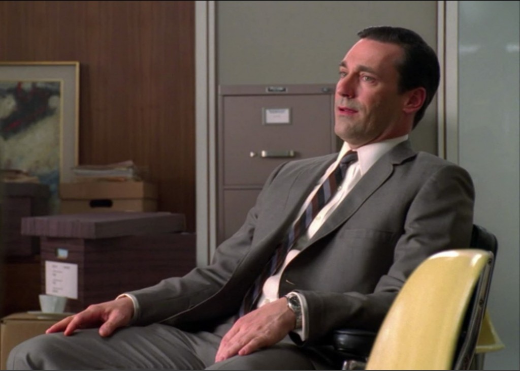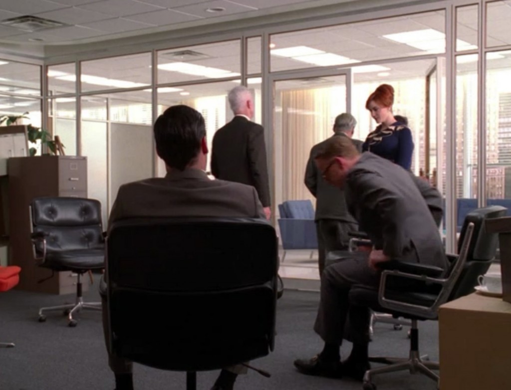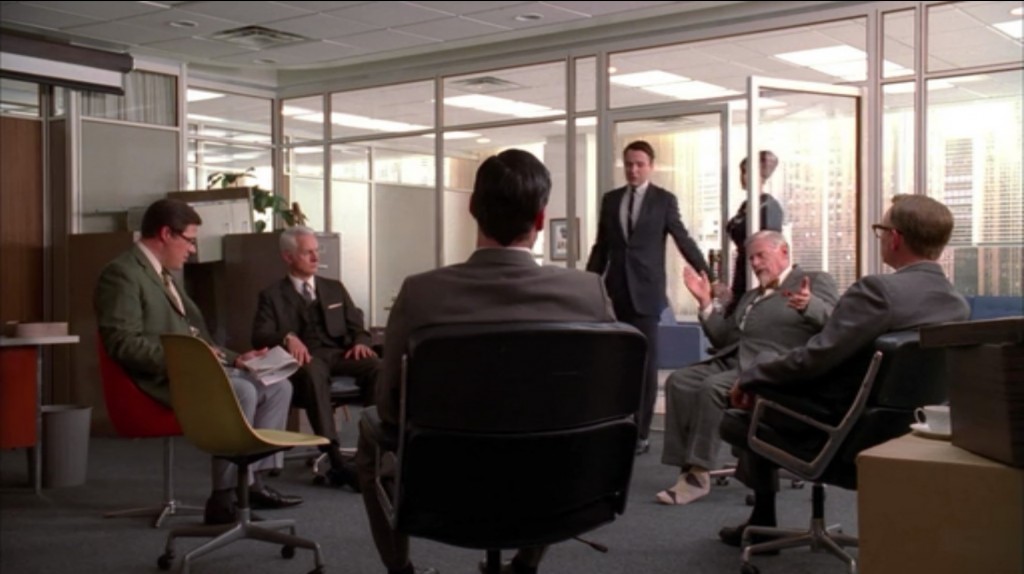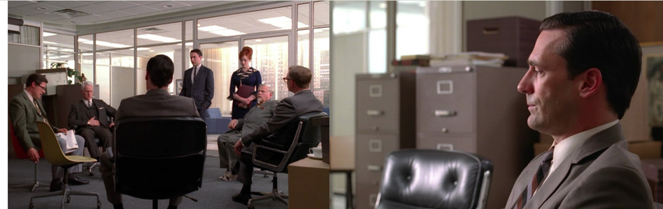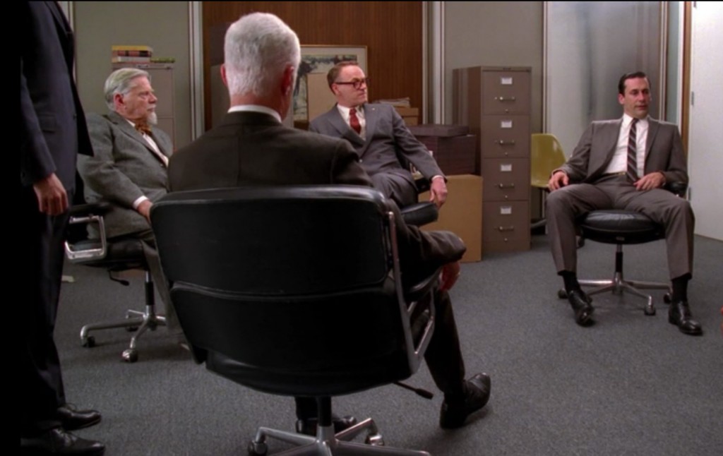 The Eames molded plastic side chair in yellow is on Don’s left. And in this next series of shots you get a better look at the four Eames Executive chairs in black leather.