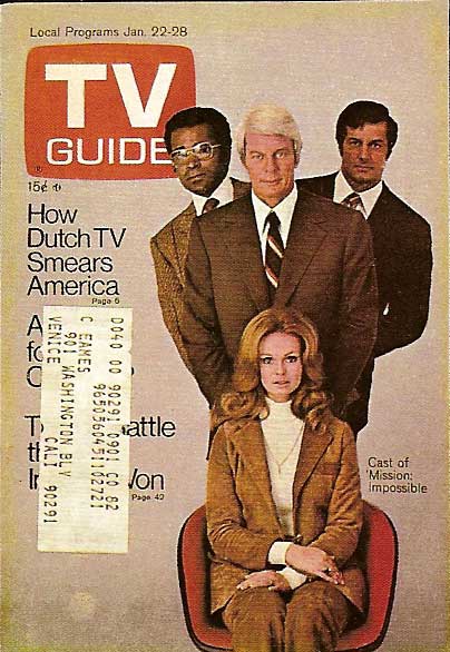 La Fonda chair and cast of Mission Impossible on TV Guide, 1965
