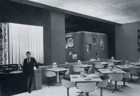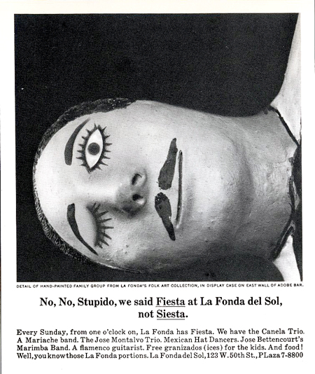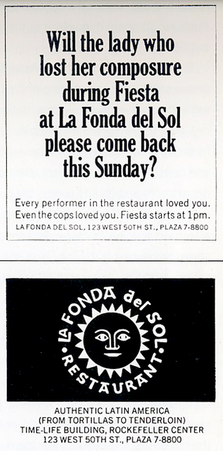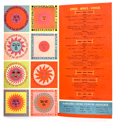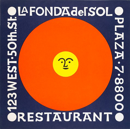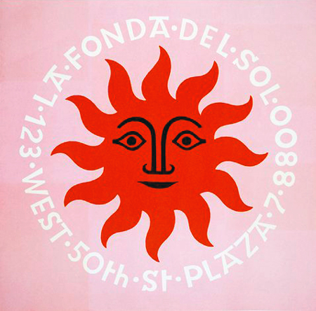 A great example of this approach is Alexander Girard’s design for La Fonda del Sol restaurant. In 1960, Restaurant Associates hired Girard to oversee all elements from the logo to the plates. Located in the Time & Life building in New York, La Fonda del Sol embraced the international ambitions of Rockefeller Center. Girard’s identity is varied and uses a multiple set of icons. What, you say, more than one logo? Was he mad? I don’t know about Girard’s psychological health, but it works for me. The restaurant paired the hand-made, craft of Mexico with a high-end and cosmopolitan tone. The solution was years ahead of a tongue-in-cheek tone now used by Jet Blue and Virgin Air. I especially like the newspaper ad that reads, “Will the lady who lost her composure during Fiesta at La Fonda del Sol please come back this Sunday?” I’m not so sure about the completely non-politically correct Siesta ad.
